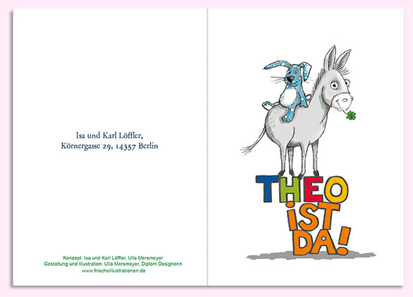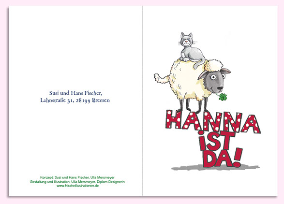 Die Baby-ist-da-Karte besteht aus einem individuellen Motiv für das Deckblatt, und dem kompletten Layout der Innenseite. Hier ist
